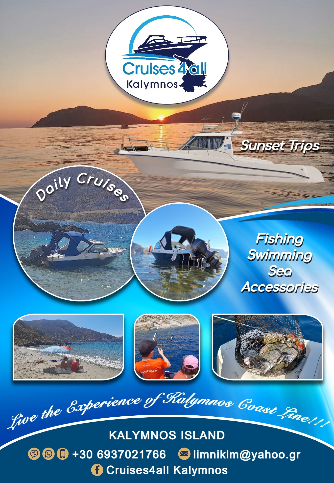 Ανακαλύψτε την αυθεντική ομορφιά της Καλύμνου και των γύρω νησιών μέσα από μοναδικές θαλάσσιες εκδρομές, σχεδιασμένες για να σας προσφέρουν ξεκούραση, εξερεύνηση και απόλαυση. Είτε θέλετε να απομονωθείτε σε ερημικές παραλίες, να ψαρέψετε με φίλους ή να επισκεφτείτε νησιά όπως την Τέλενδο, Ψέριμο, Πλάτη, Νερά, Λέρο και Ασπρονήσια η Cruises4all έχει την κατάλληλη πρόταση για εσάς.